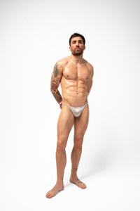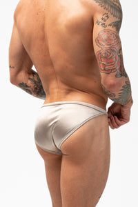 Metallic silver briefs featuring a front label and an elastic waistband.
